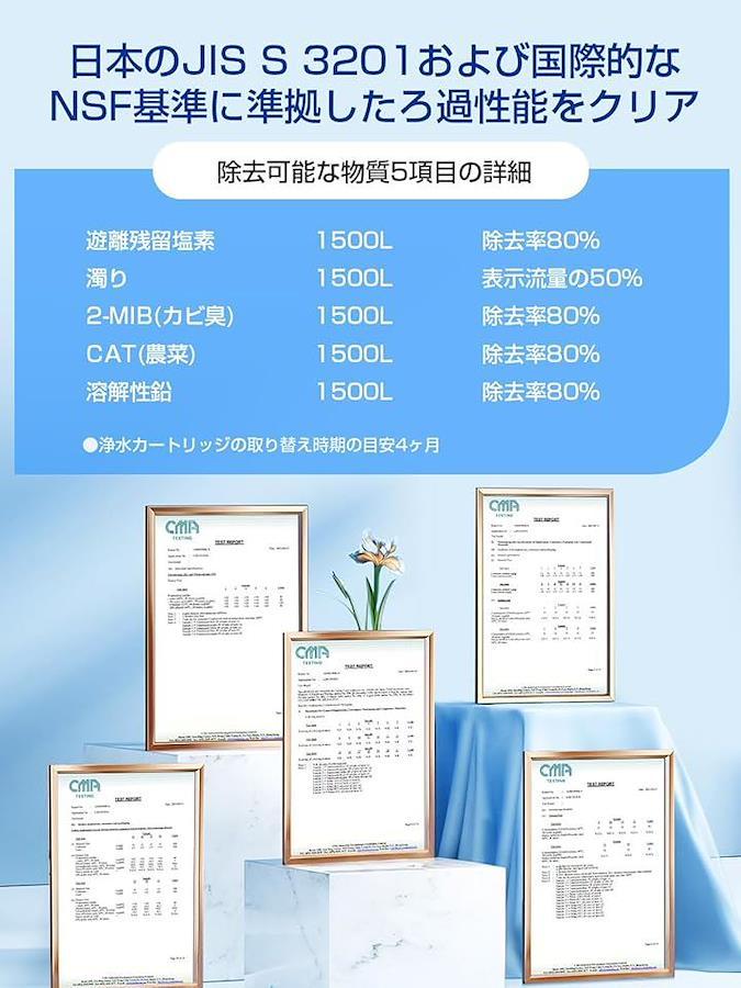 「高除去タイプ・5項目除去対応」:遊離残留塩素、PFOS・PFOA、濁度(雑菌・微粒子等)、溶解性鉛、2-MIB(カビ臭)、CAT(農薬)などの不純物を除去。