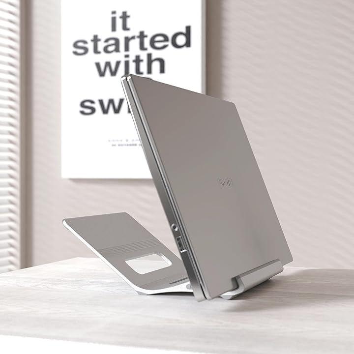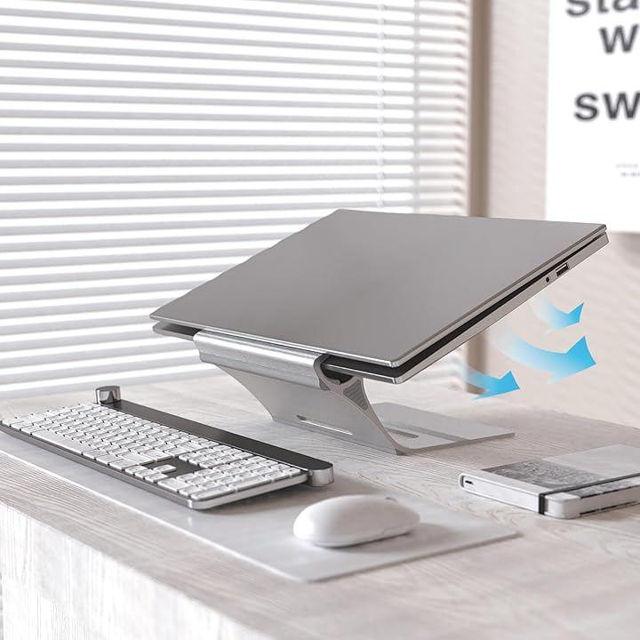 人間工学に基づいたライザー - MacBookスタンドは、ノートパソコンの画面を目の高さに上げるためのライザーとして機能し、姿勢を固定し、疲れを軽減します。