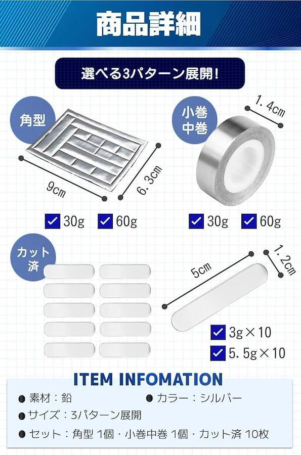 「使用方法カンタン」両面テープの剥離紙を剥がし、重量を増やしたい場所に貼り付けるだけ。柔らかい素材なので、必要に応じてカットをする事も可能。