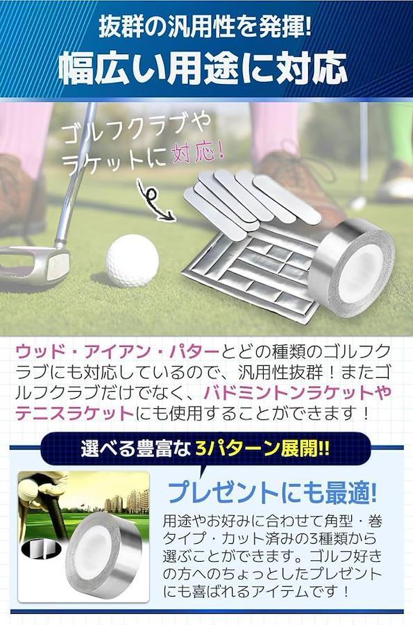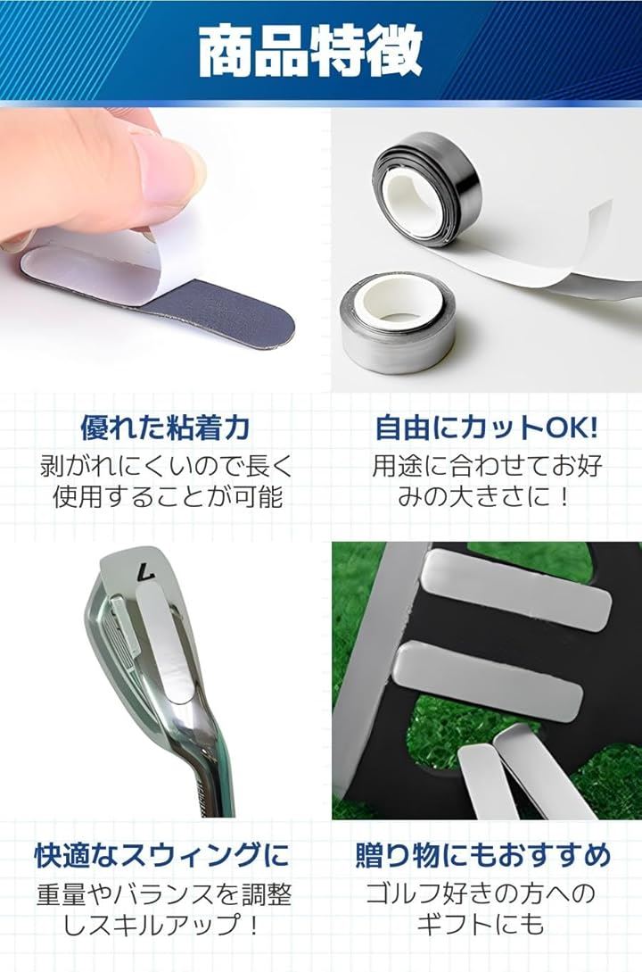 「商品特徴」(1)優れた粘着力:剥がれにくいので長く使用することが可能/(2)自由にカットOK.:用途に合わせてお好みの大きさに。/(3)快適なスウィングに:重量やバランスを調整しスキルアップ。/(4)贈り物にもおすすめ:ゴルフ好きの方へのギフトにも