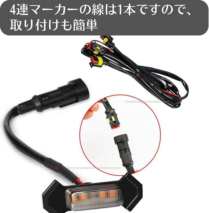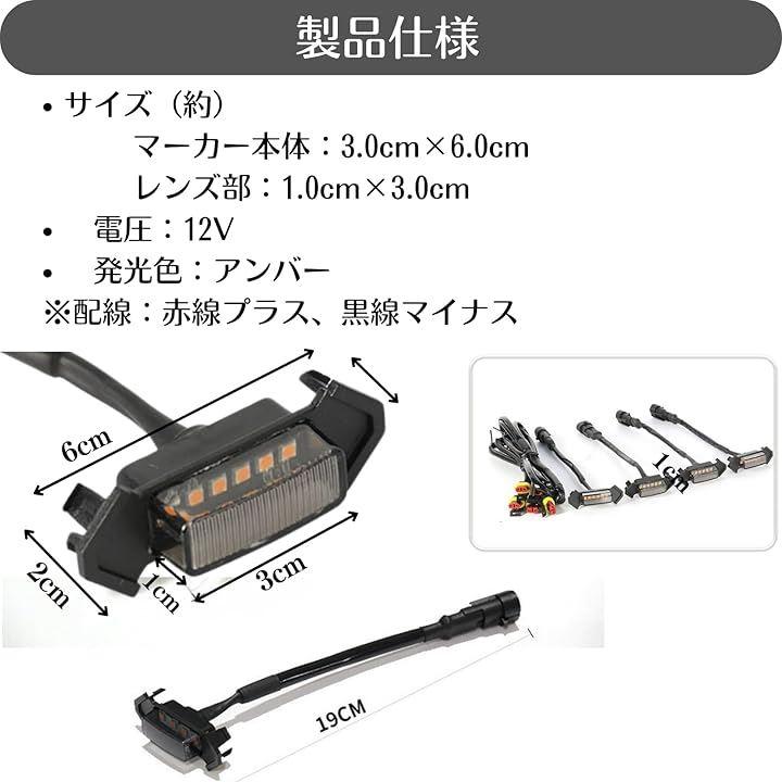サイズ(約):マーカー本体:3.0cmx6.0cm レンズ部:1.0cmx3.0cm 電圧:12V 発光色:アンバー *配線:赤線プラス、黒線マイナス 4連マーカーのプラスマイナス線は1本ですので、取り付けも簡単です。