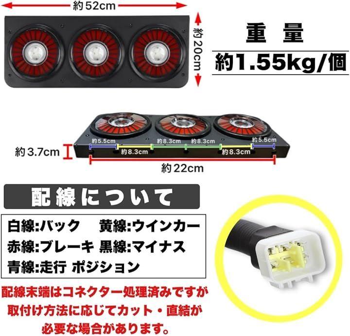 「商品仕様」 電圧:24V サイズ:縦:約20cm 横:約52cm 配線: ・白線:バックランプ用 ・黄線:ウインカー用 ・赤線:ブレーキランプ用 ・青線:スモール・ポジションランプ用 ・黒線:マイナス(アース) *配線末端はコネクター処理済みですが、取り付け方法に応じてカット・直結が必要な場合があります。