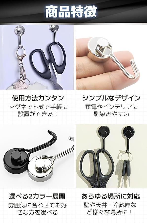 「商品特徴」(1)使用方法カンタン:マグネット式で手軽に設置ができる。/(2)シンプルなデザイン:家電やインテリアに馴染みやすい/(3)選べる2カラー展開:雰囲気に合わせてお好きな方を選べる/(4)あらゆる場所に対応:壁や天井・冷蔵庫など様々な場所に。