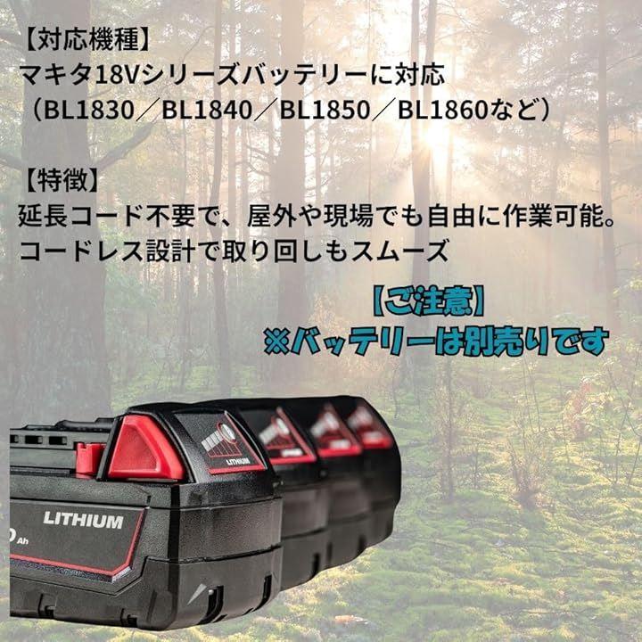「コードレス設計」マキタ18Vシリーズバッテリーに対応(BL1830/BL1840/BL1850/BL1860など)。