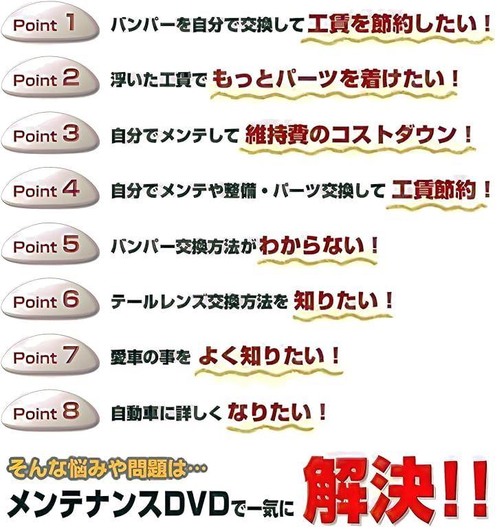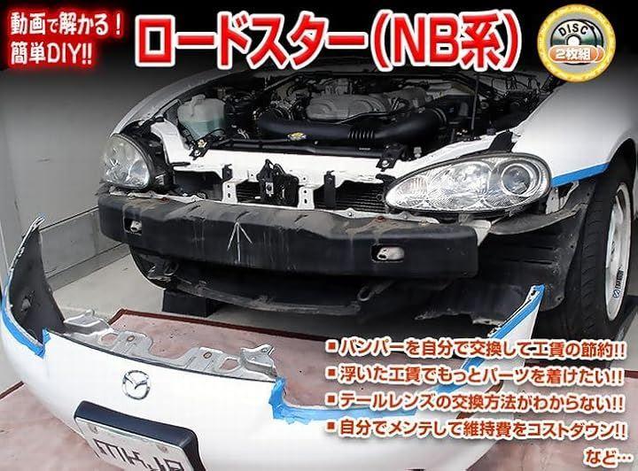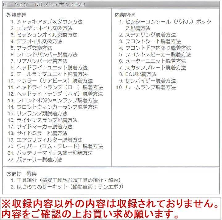 ロードスター NB DVD収録内容:[外装関連] 1.ジャッキアップ&ダウン方法 2.エンジンオイル交換方法 3.ミッションオイル交換方法 4.デフオイル交換方法 5.プラグ交換方法 6.フロントバンパー脱着方法 7.リアバンパー脱着方法 8.ヘッドライトユニット脱着方法 9.テールランプユニット脱着方法 10.マフラー(リアピース)脱着方法 11.ヘッドライトランプ(ロー)脱着方法 12.ヘッドライトランプ(ハイ)脱着方法 13.フロントポジションランプ脱着方法 14.フロントウィンカーランプ脱着方法 15.リアランプ類脱着方法 16.ライセンスランプ脱着方法 17.サイドマーカー脱着方法 18.サイドミラー脱着方法 19.エアクリフィルター脱着方法 20.ワイパー(ゴム・ブレード)脱着方法 21.バッテリーマイナス端子絶縁方法 22.バッテリー脱着方法