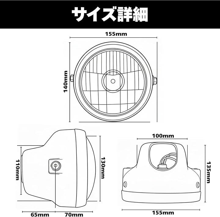 レンズ径130mm:4ミニ(モンキー/エイプ等)にバランス良いサイズ/ガラスレンズ採用:樹脂レンズより重厚感・耐熱性が高い/ポジション球付き:被視認性アップ/取付幅155mm/M8ボルト付属:汎用ステーに対応しやすい