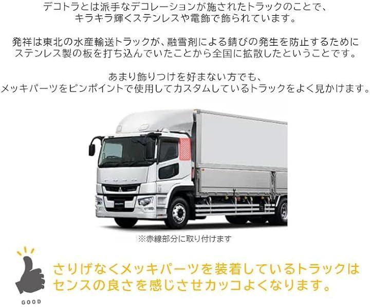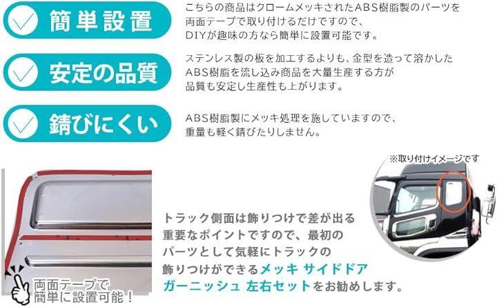 トラック側面は飾りつけで差が出る重要なポイントですので、最初のパーツとして気軽にトラックの飾りつけができるメッキ サイド ドア ガーニッシュ 左右セットをお勧めします。