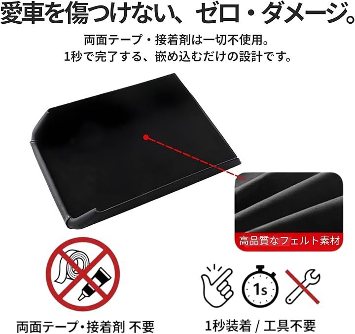 コンソールカバーやコンソールボックスカバーにありがちな跡残りやベタつきを避け、内装を過度に触らずに設置できます。