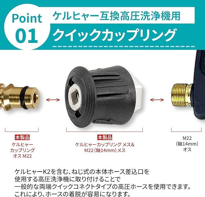 互換性 : アダプターを使えば、一般的なM22/14mmネジ規格に対応し、国内外のさまざまなメーカーの高圧ショートガンや高圧ホースを、お手持ちのケルヒャー高圧洗浄機に取り付けることができます。