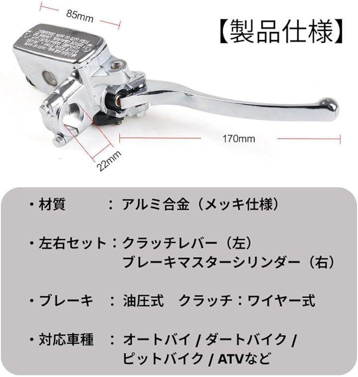 *「製品仕様・対応車種」 ・材質:アルミ合金(メッキ仕様) ・左右セット:クラッチレバー(左)/ブレーキマスターシリンダー(右) ・ブレーキ:油圧式 クラッチ:ワイヤー式 ・対応車種:多くのオートバイ、ダートバイク、ピットバイク、ATVなど