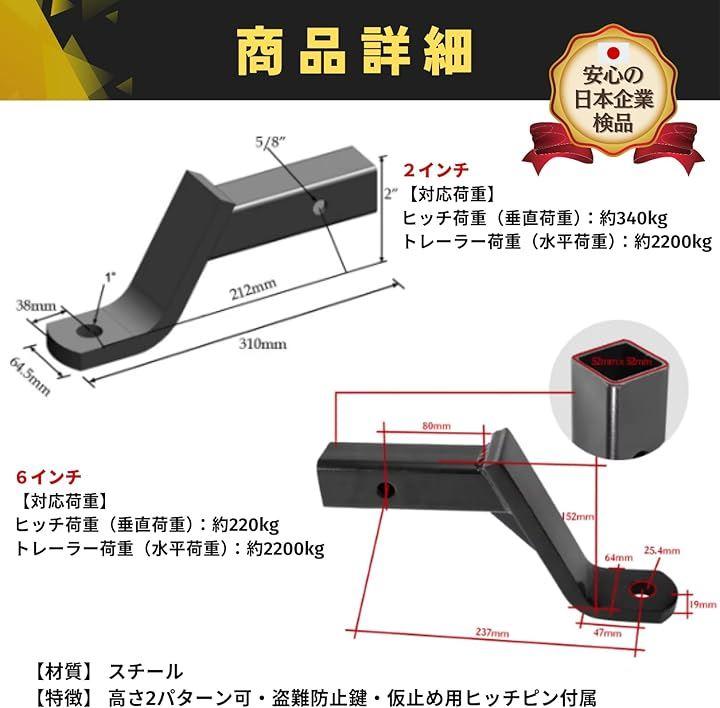 「対応荷重」 2インチ:ヒッチ荷重(垂直荷重):約340kg トレーラー荷重(水平荷重):約2200kg / 6インチ:ヒッチ荷重(垂直荷重):約220kg トレーラー荷重(水平荷重):約2200kg
