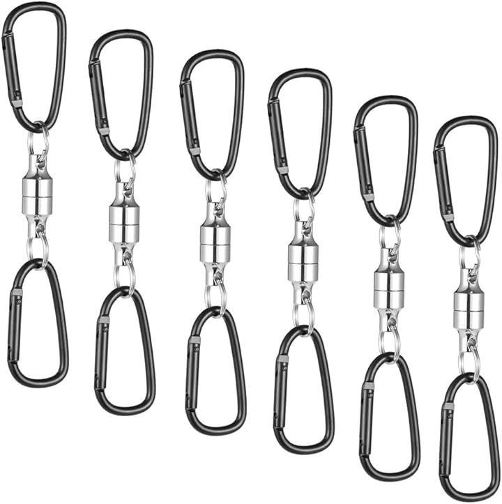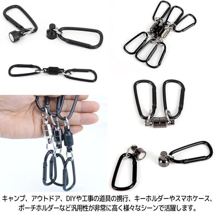 「カラー」シルバー、グレー、ブラック「セット数」6個セット「材質」ニッケルメッキ、ネオジム磁石「サイズ」カラビナ:幅2.4cm、磁石:中心太さ1.3cm、長さ3.6cm、総長15cm「重量」38g