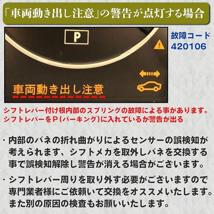 ・「車両動き出し注意」の警告が点灯する場合、シフトレバー付け根内部のスプリングの故障による事があります。
