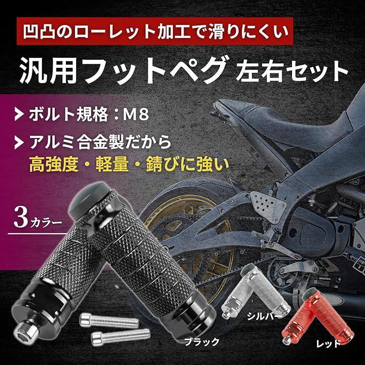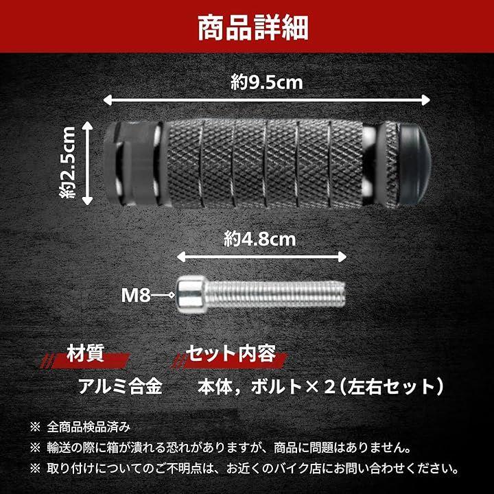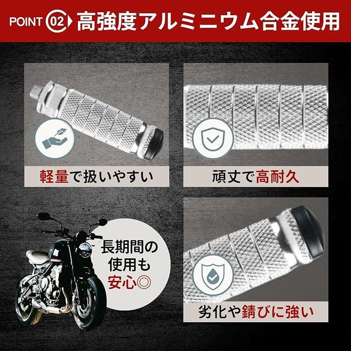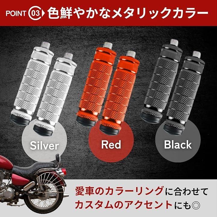 「愛車に快適さとスタイルをプラス。汎用フットペグ」バイクの乗り心地と見た目をワンランクアップ。この汎用フットペグは、あらゆるバイクに対応する高い汎用性とデザイン性が魅力です。