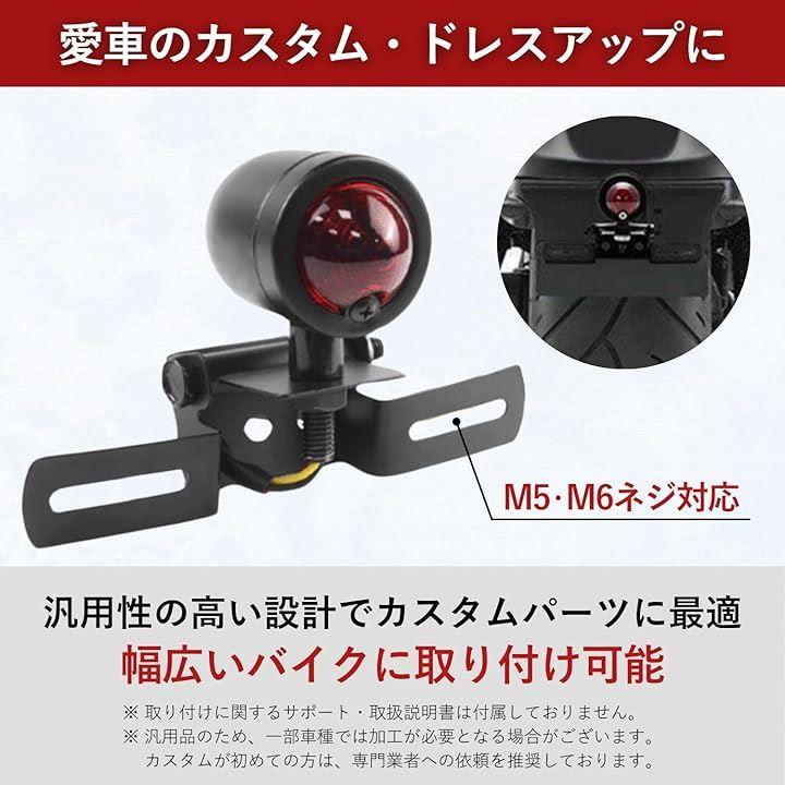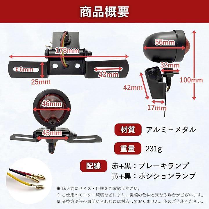 「仕様詳細」 発光色:レッド 機能:スモール+ブレーキ 配線方法:赤+黒=ブレーキ/黄+黒=ポジション 素材:アルミ+メタル ネジ穴径:M5・M6対応 カラー:ブラック(本体)、レッド(レンズ)