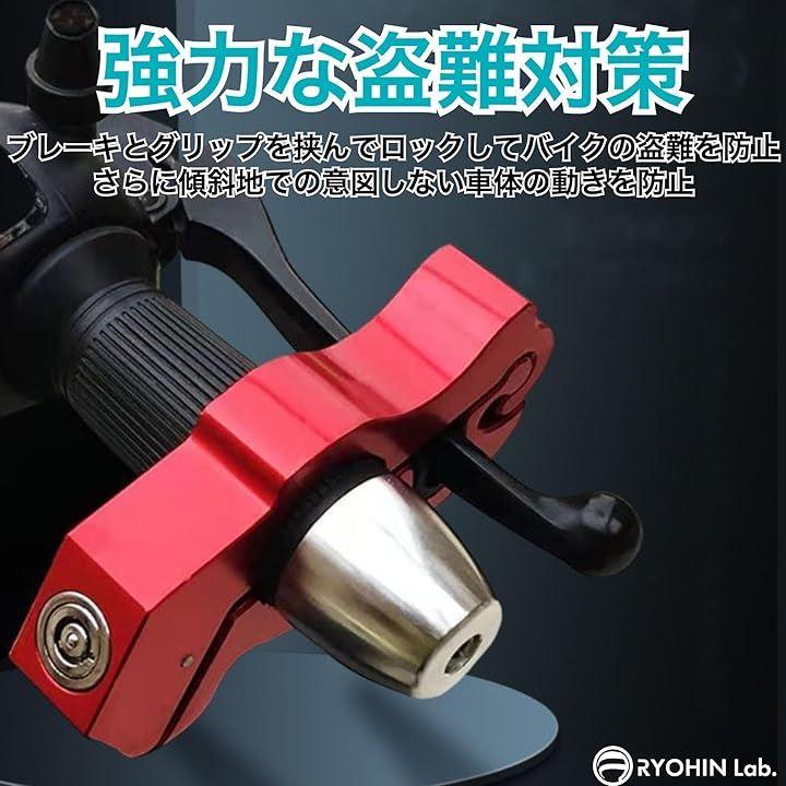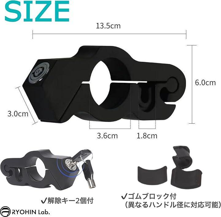 「商品内容」パッケージ内容:ブレーキロック本体x1個・専用鍵x2個、本体サイズ(約):長さ135mmx高さ60mmx幅36mm、グリップ径 27~38mm・レバー径 18~20mm に適合、材質:アルミ合金