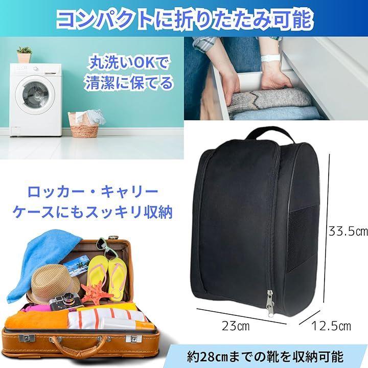 「対応サイズと汎用性」 外寸約33.5x23x12.5cmで、28cmまでの靴に対応。