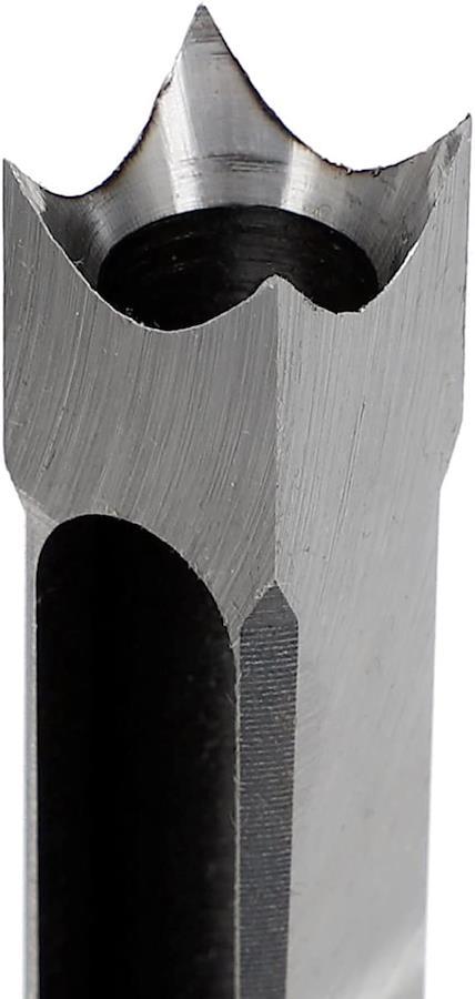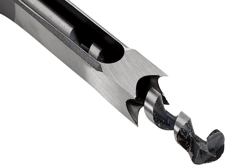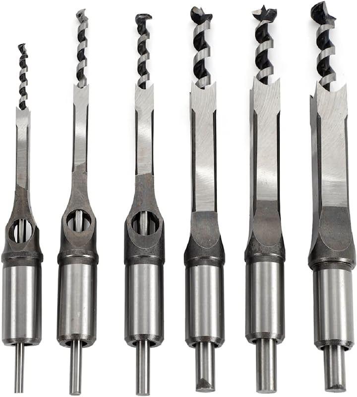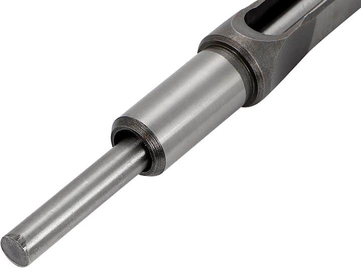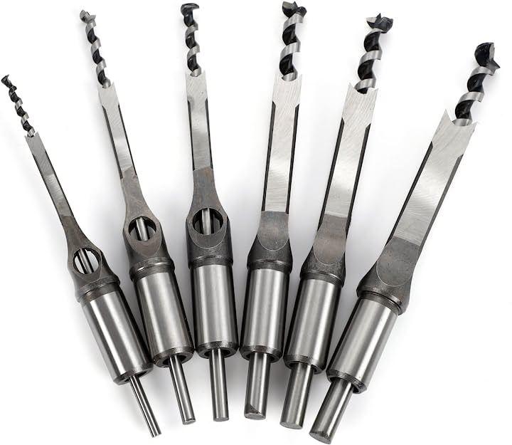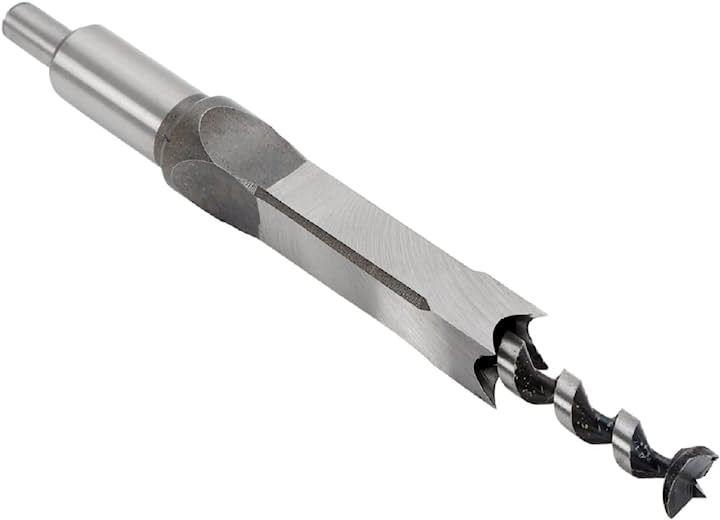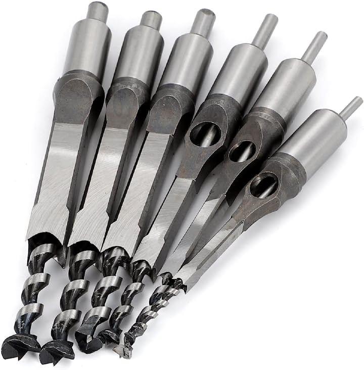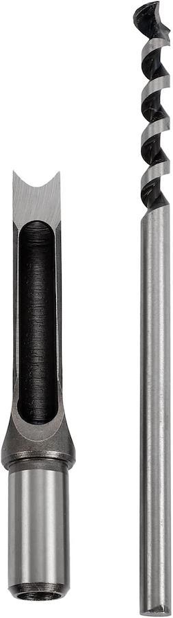 外周が四角いノミ状で、空洞になっている内部にドリルが通り、カドが直角に削られます。