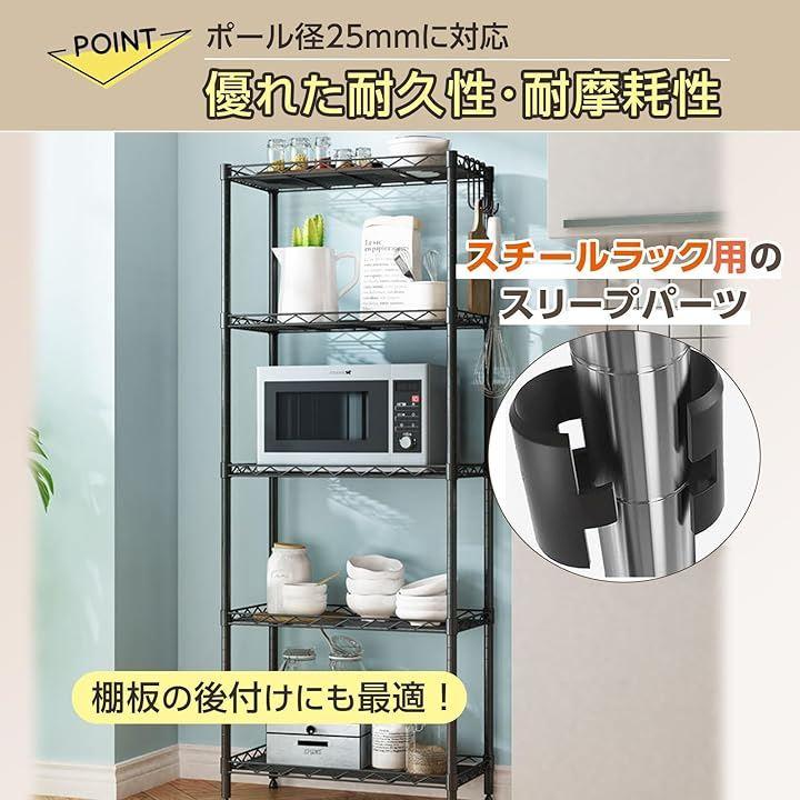 「特徴」取付部品として活用できるスチールラック用スリーブは、ポール径25mmに適応し、棚板の追加設置をサポート。