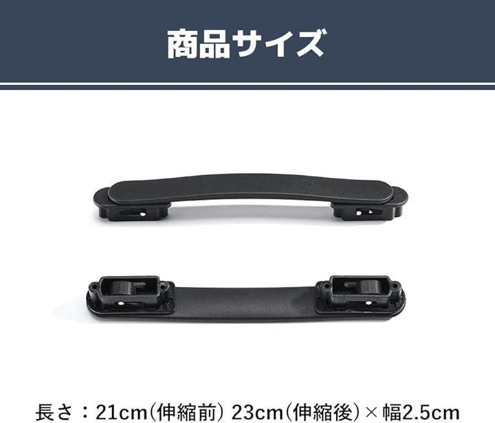 「商品詳細」サイズ:長さ21cm(伸縮前) 23cm(伸縮後)x幅2.5cm 重さ:80グラム カラー:ブラック 素材:プラスチック パッケージ内容:ハンドルx1本 ネジx4本