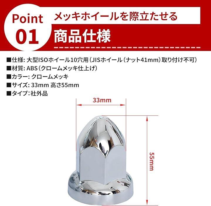 商品仕様 : 仕様: 大型ISOホイール10穴用(JISホイール(ナット41mm)取り付け不可)・材質: ABS(クロームメッキ仕上げ)・カラー: クロームメッキ・サイズ: 33mm 高さ55mm