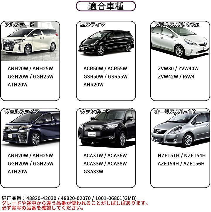 ・「適合車種」アルファード/ヴェルファイア(ANH20W ANH25W GGH20W GGH25W ATH20W)、エスティマ(ACR50W ACR55W GSR50W GSR55W AHR20W)、プリウス/プリウスα( ZVW30 ZVW40W ZVW41W)RAV4/ヴァンガード(ACA31W ACA36W ACA33W ACA38W GSA33W)、オーリス/ブレイド(NZE151H NZE154H AZE154H AZE156H)、純正品番:48820-42030、48820-02070 、1001-06801(GMB) *同じグレードや年式でも、ロットで装着されている品番が異なることがございます。