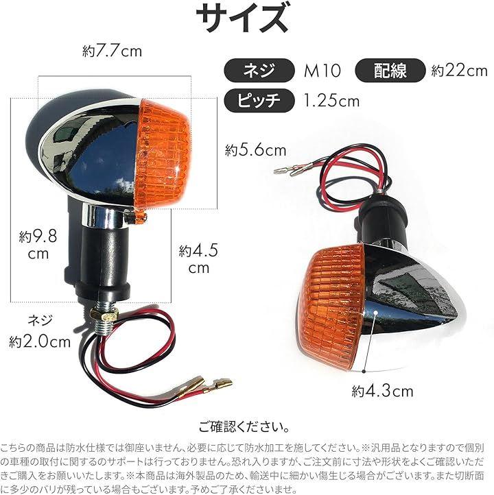 ウインカーのサイズ:ライト部分:(7.7cm 5.6cm 4.3cm) 足回り:(ボルトを含まず 4.5cm) ボルト:(M10 10mm ピッチ1.25) ご確認ください:こちらの商品は防水仕様では御座いません、必要に応じて防水加工を施してください。
