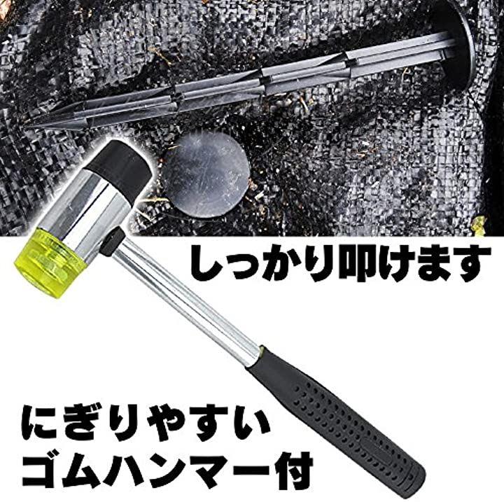 更に。手作業の杭打ちは大変な作業の上、固くて深く刺さりにくい地面に活躍する持ちやすいハンマーをセットにしました。