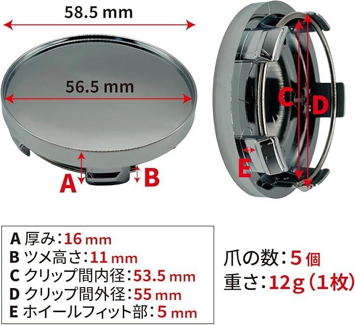「商品サイズ」外径:約58.5mm、ステッカー貼付部径:約56.5mm、クリップ間外径:約55mm、クリップ間内径:約53mm、高さ:約16mm、ツメ高さ:約11mm、ツメの数:5個「商品内容」ホイールセンターキャップ4個「バリエーション」シルバー、ブラック