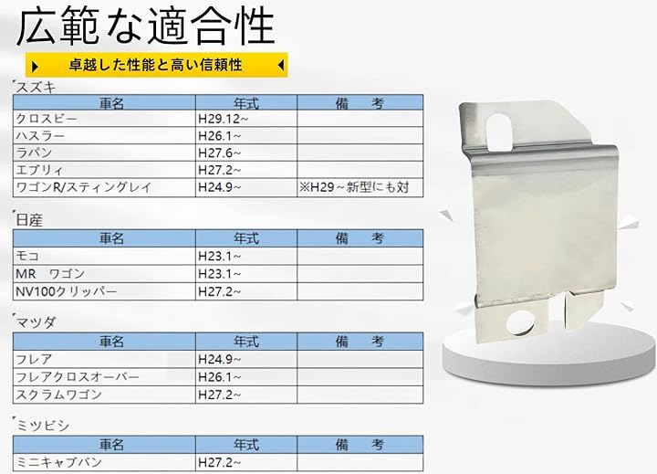 「取付可能車種」スズキ ハスラーH26.1~、クロスビー XBEE 、ラパンH27.6~、 エブリィH27.2~、 ワゴンR/スティングレイH24.9~(*H29新型にも対応) 日産 モコH23.1~ MRワゴンH23.1~ NV100クリッパーH27.2~ マツダ フレアH24.9~ フレアクロスオーバーH26.1~ スクラムワゴンH27.2~ ミツビシ ミニキャブバンH27.2~ - 幅広い車種に対応可能です。