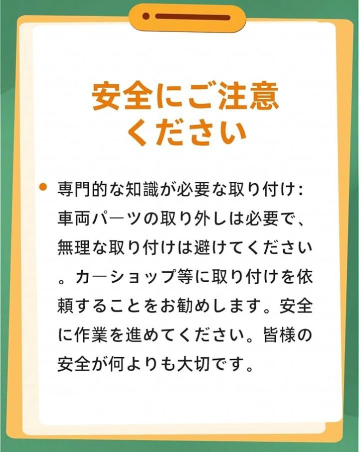 「安全にご注意ください」専門的な知識が必要な取り付け:車両パーツの取り外しは必要で、無理な取り付けは避けてください。