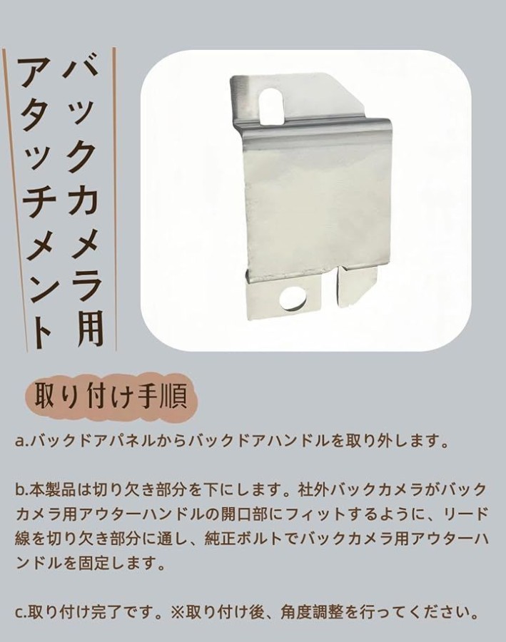 社外バックカメラがバックカメラ用アウターハンドルの開口部にフィットするように、リード線を切り欠き部分に通し、純正ボルトでバックカメラ用アウターハンドルを固定します。