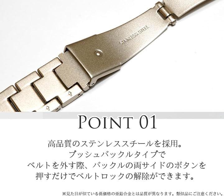 ステンレススチールの磨き上げられた美しいデザインが特徴で、チェーンはポリッシュ加工、コマは高品質サテン仕上げで、高級感漂う美しい輝きのバンドです。