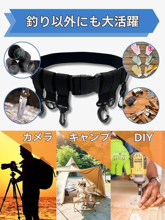 「多用途に使用可能」釣りの際の小物の収納はもちろん、カメラマン用ベルトとしてレンズケースやアクセサリーなどの小物をぶら下げたり、キャンプの際にはナイフや火おこし道具、ライドを掛けておいて必要な時にサッと使うことができます。