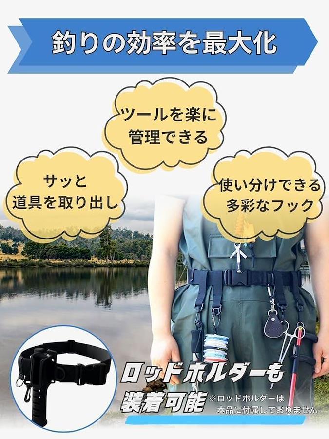 「多機能フィッシングベルトで釣りの効率を最大化」このフィッシングベルトは釣り道具をスマートに整理し、すぐに道具にアクセスできる汎用アイテムです。