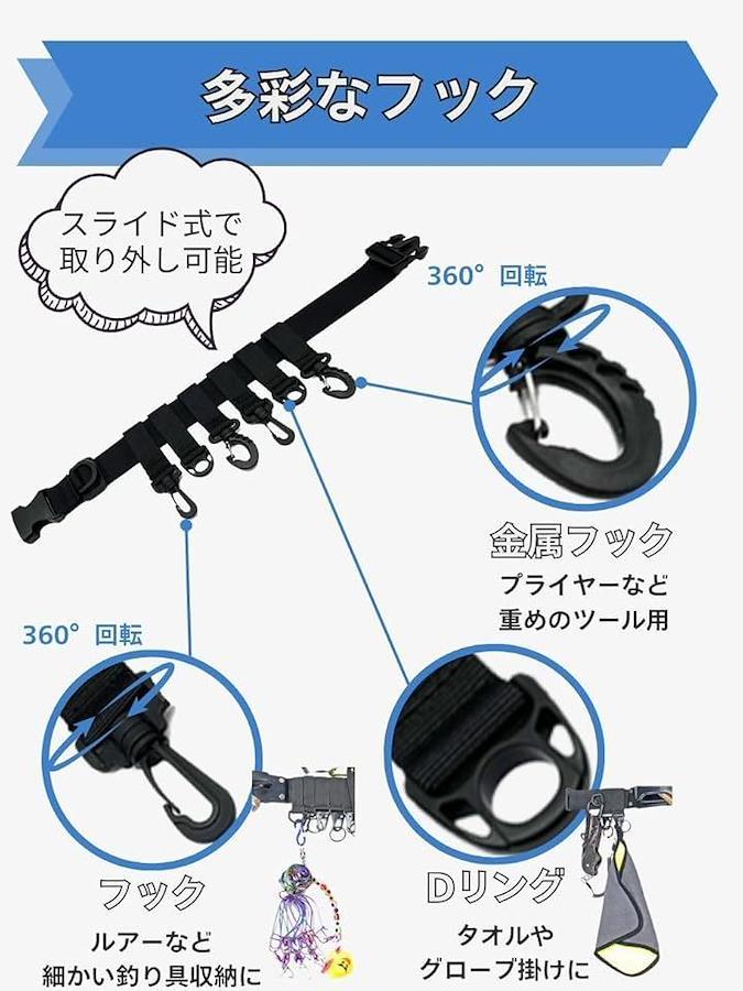 固定のDリングと取り外し可能なDリング2個、回転可能な金属フック2個とプラスチックフック2個を備えており、プライヤー、ラインカッター、ルアーなどの小物をしっかりと管理できます。