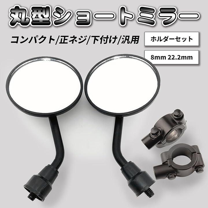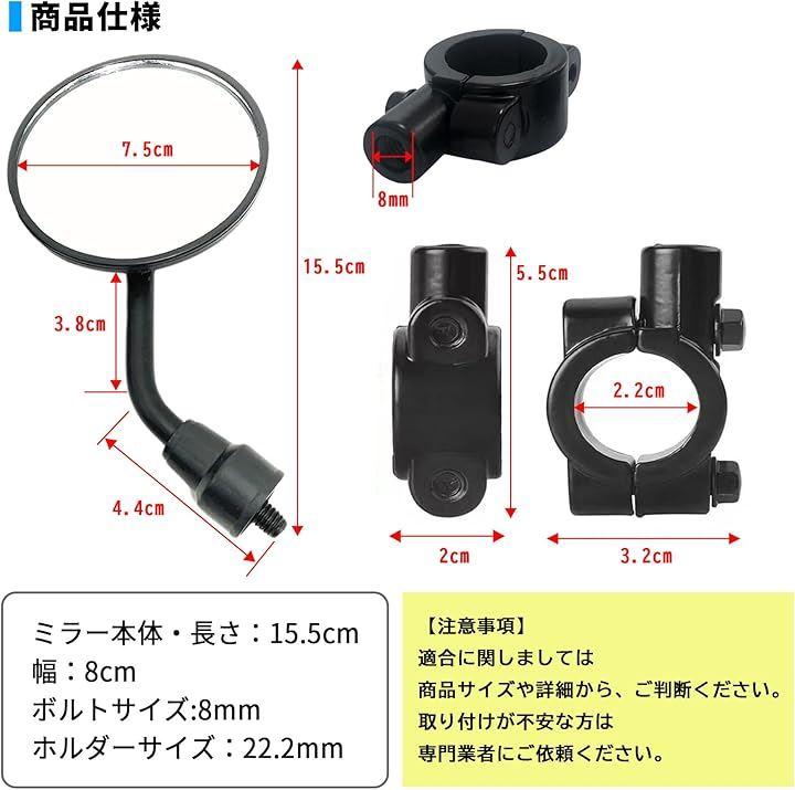 「サイズ」ミラー本体・長さ:15.5cm 幅:8cm ボルトサイズ:8mm ホルダーサイズ:22.2mm