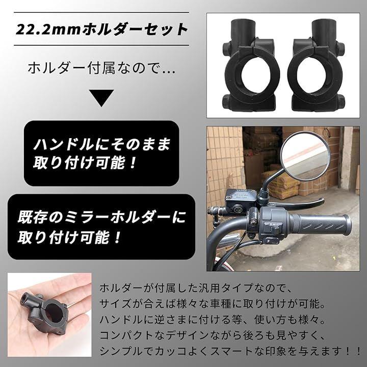 「22.2mmホルダーセット」ホルダーも付属していますので、ハンドルにそのまま取り付けや、既存のミラーホルダーに取り付けなど様々な方法で取り付け可能になります。