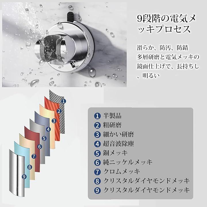 角度調整 多段階、9層のクロムメッキ技術、酸化しにくい、表面がつやつや、その他の浴室の部品と一体感 。