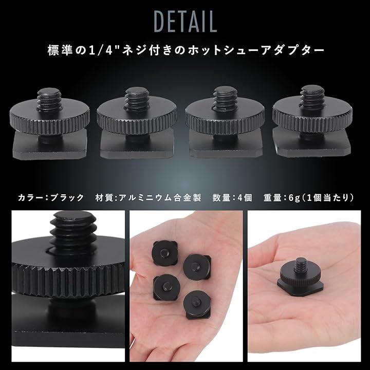 品名:標準の1/4ネジ付きのホットシューアダプター カラー:ブラック 材質:アルミニウム合金製 数量:4個
