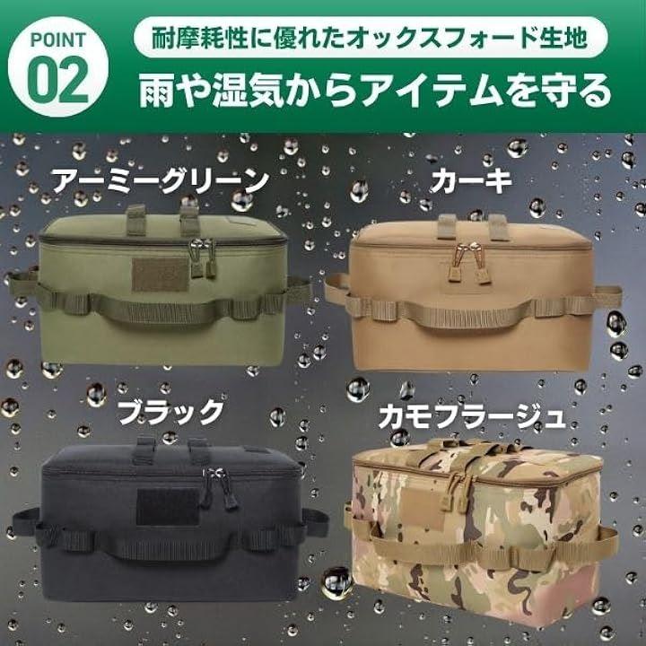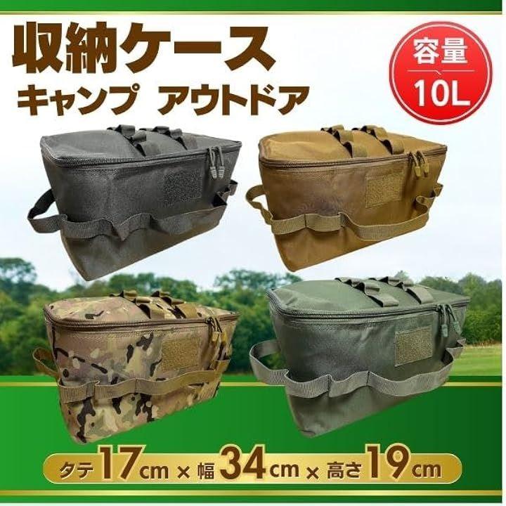 「製品仕様」 高品質な600Dオックスフォード生地を採用し、耐久性と耐水性に優れたアウトドア収納ケース 約34cmx17cmx19cmの大容量設計で、ペグやハンマー、調味料、調理器具などの収納に最適 内部にはクッション材を搭載し、大切なアイテムを衝撃から保護 さらに、ダブルジッパーデザインにより開閉がスムーズで、使い勝手抜群