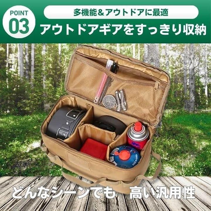 このアウトドア収納ケースは、高品質な600Dオックスフォード生地を採用し、耐久性・耐水性に優れた大容量の収納バッグです 仕切り付きで整理しやすく、取り外せばランチボックスや日用品収納としても活用可能 内部のクッション材が収納物を衝撃から守り、ダブルジッパーで開閉もスムーズ キャンプやBBQ、釣り、小型ストーブや調理器具の収納に最適で、旅行やスポーツなど多彩なシーンで活躍する便利なアイテムです