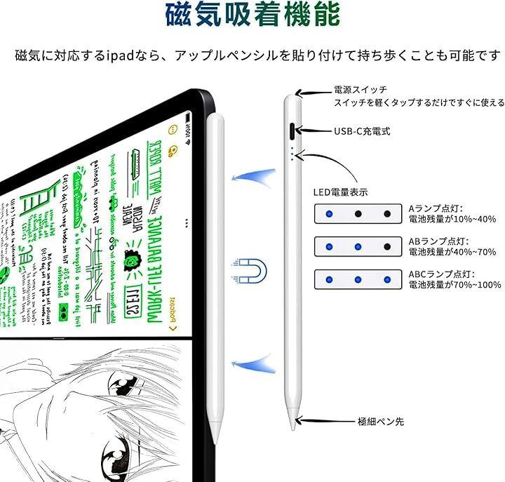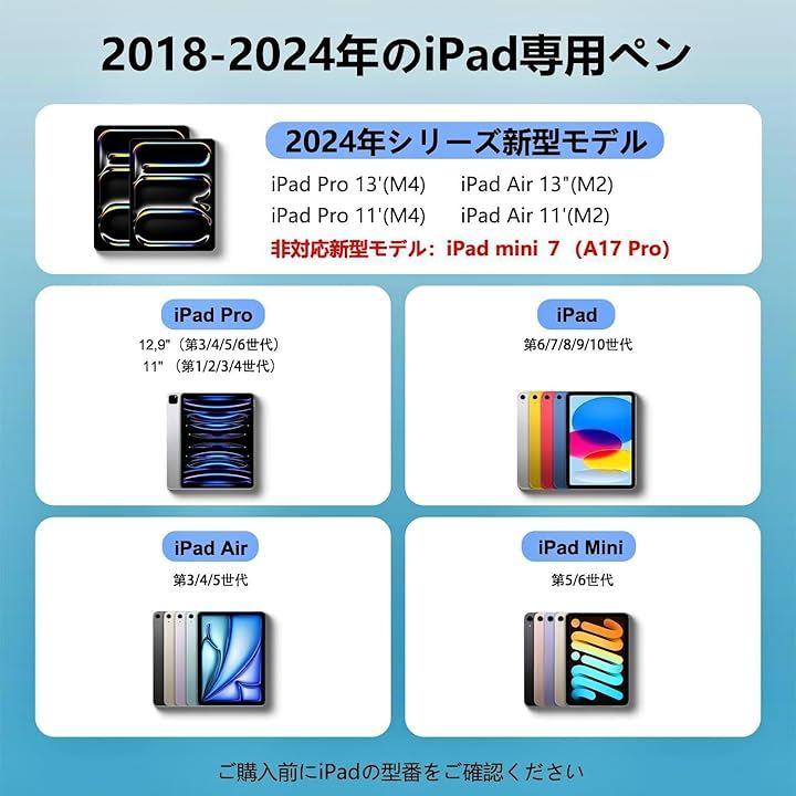 「2018年以降のiPad専用タッチペン」対応機種:iPad (第6/7/8/9/10世代)、iPad Pro 12.9” (第3/4/5/6世代) 、iPad Pro 11”(第1/2/3/4/M4世代) 、iPad Pro 13(第M4世代)、iPad Air (第3/4/5/M2世代) 、iPad mini (第5/6世代)。