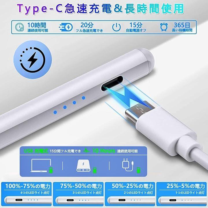「高速充電時間」:約15分「連続使用時間」:約10時間「セット内容」:ipad専用 ペン x 1本、交換用ペン先x3個[(POM)x2個 / 金属製x1個)]、充電用USB type-Cケーブルx1本(32cm)、取扱説明書。