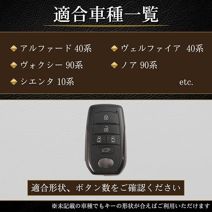 「適合車種」 アルファード 30系 40系 (ALPHARD) / ヴェルファイア 30系 40系 (VELLFIRE) / ヴォクシー 90系 (VOXY) / シエンタ 10系 15系 70系 (SIENTA) / ノア 90系 (NOAH) / クラウン マークX RAV4 / ヤリスクロス 10系 / RAV4-PHV 50系 / ハリアー 80系 (HARRIER) / プリウス 60系 (PRIUS) / クラウンスポーツ / クラウンクロスオーバー / カローラ / カローラスポーツ / カローラツーリング / GRヤリス / GRカローラ / ランドクルーザー 200系 300系 / レクサス Lexus LM350等、5ボタン式スマートキー形状が一致する商品であれば適応可能です。