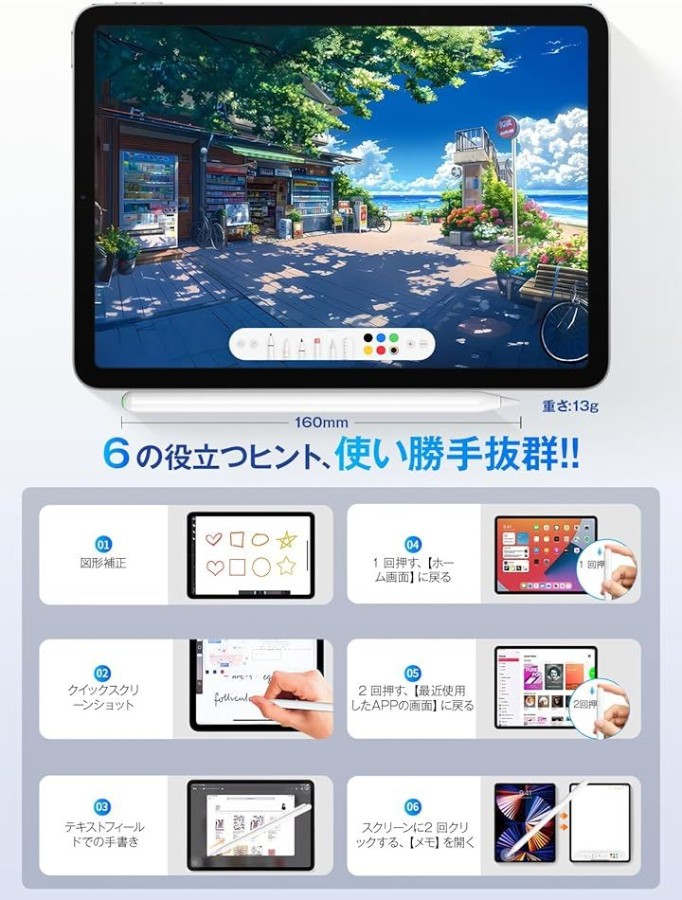 クイックスクリーンショット、テキストフィールドでの手書き、 図形補正 、スイッチを一回押すと「ホーム画面」に戻るなどの6大機能で、いつでもどこでもiPadを楽しむことができます。また、このペンは複数のiPadで同時に使用することができます。