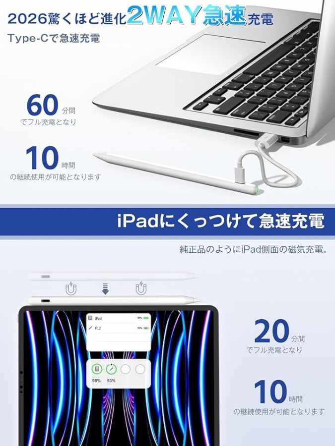 Viangs最新のiPad用タッチペンは、磁気吸着ワイヤレス充電とType-C充電に対応した2WAY急速充電設計を採用。