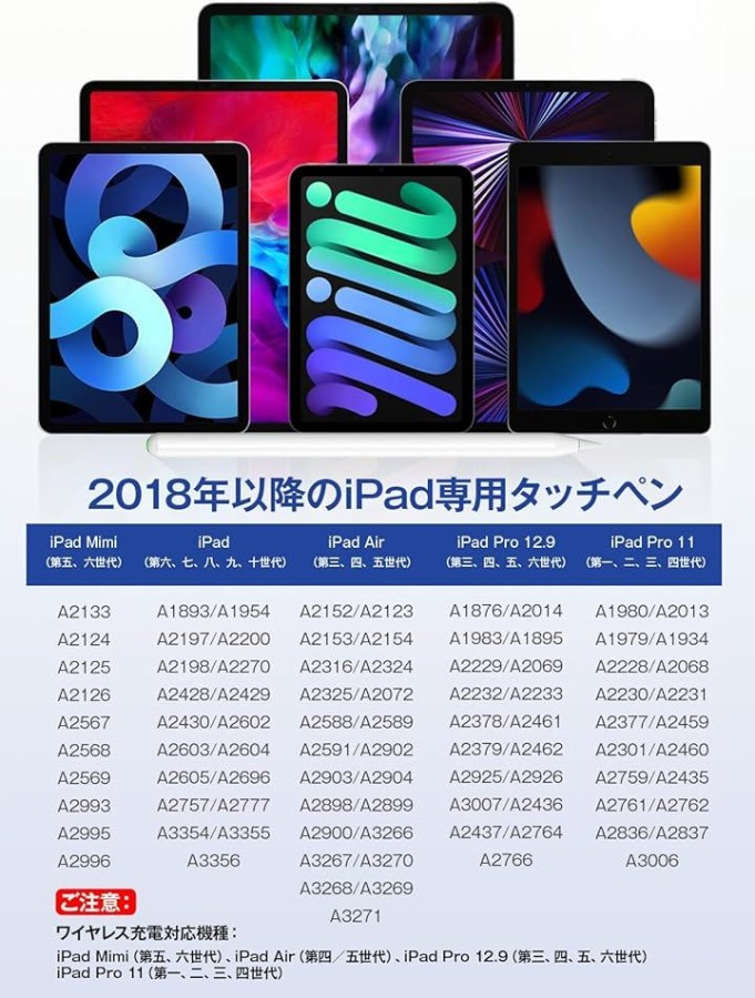 「幅広く互換性」このあいぱっと タッチペンは2018年以降発売のiPadシリーズに対応:iPad(第6/7/8/9/10/11世代)、iPad mini (第5/6/7世代)、iPad Air(第3/4/5世代/M2/M3)、iPad Pro 11インチ(第1/2/3/4世代/M4)、iPad Pro 12.9インチ(第3/4/5/6世代/M4)。
