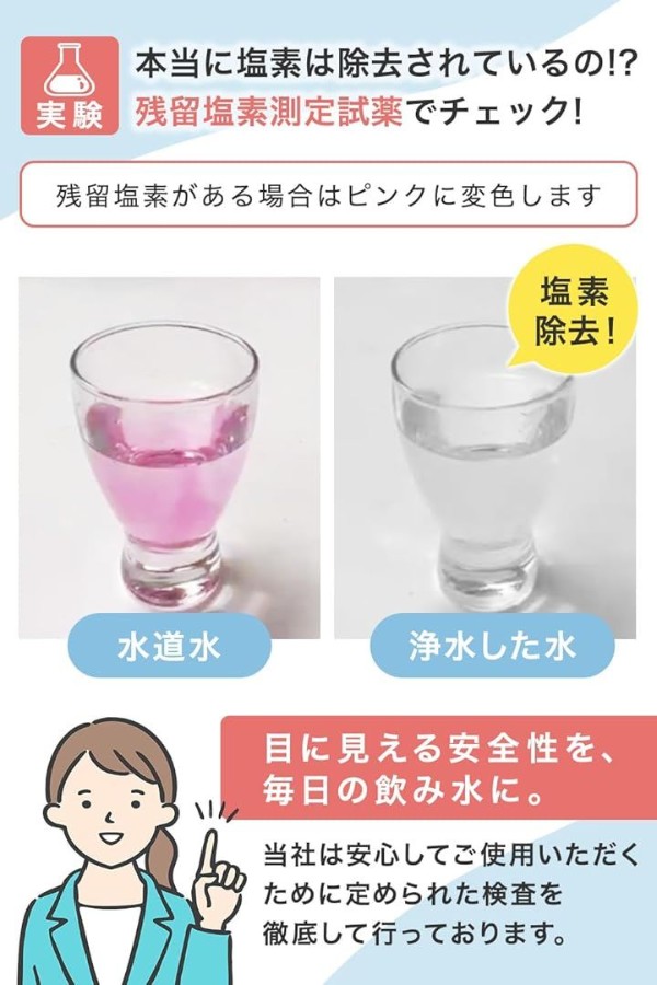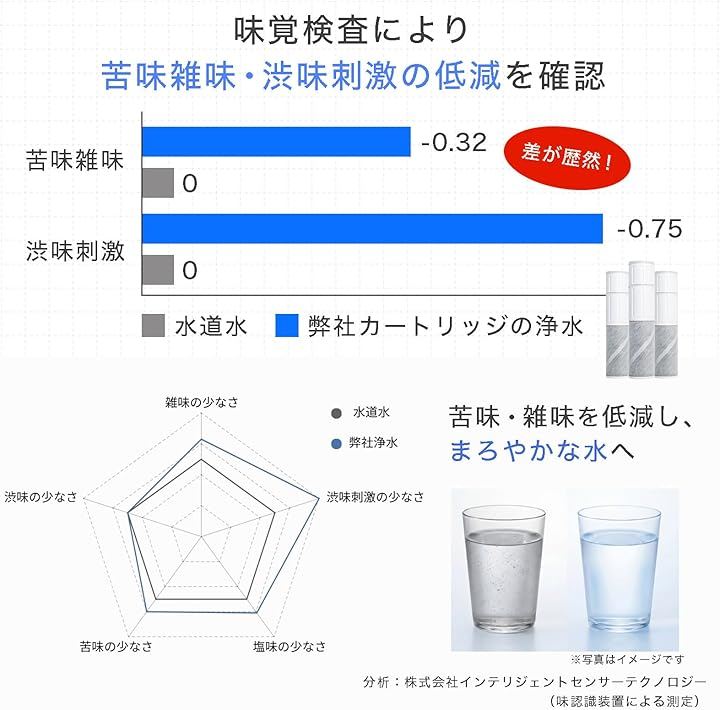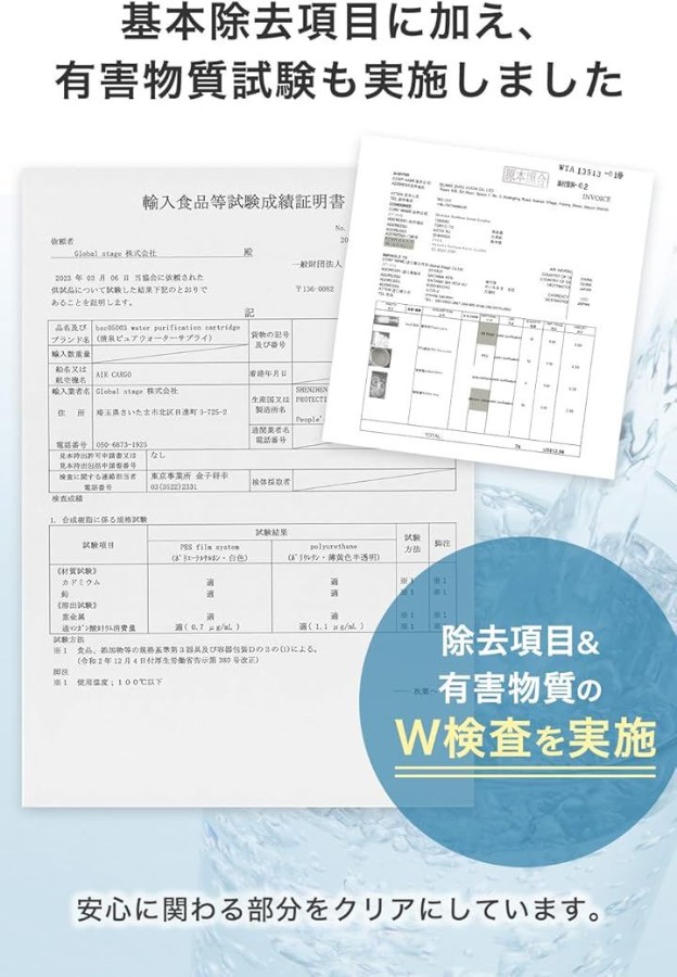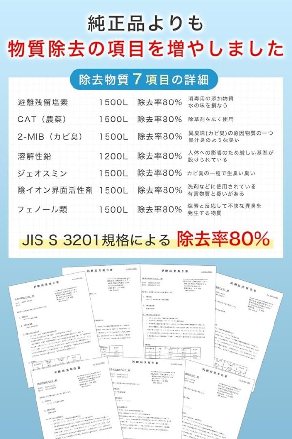 「浄水能力」 7物質除去(遊離残留塩素、CAT、2-MIB[カビ臭]、溶解性鉛、フェノール類、ジェオスミン、陰イオン界面活性剤) *一部パッケージには除去項目の反映・記載がない場合がありますが、試験にて7項目すべての除去性能を確認済みです。