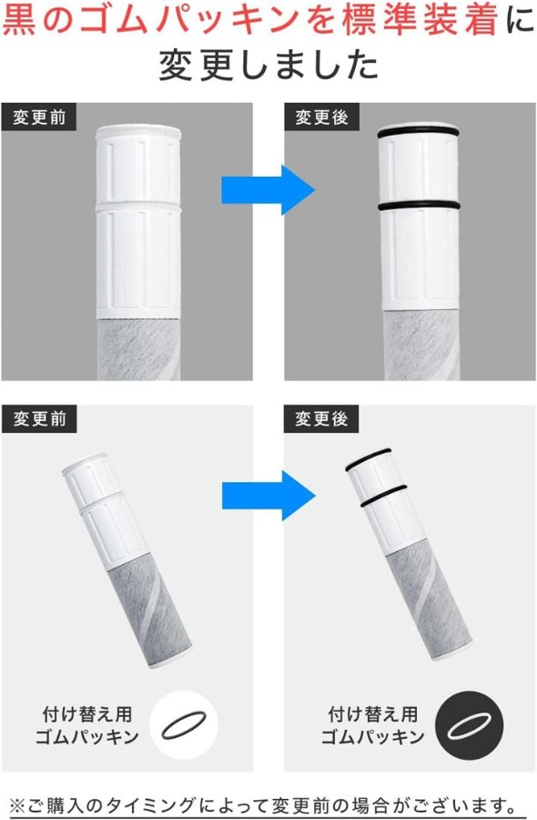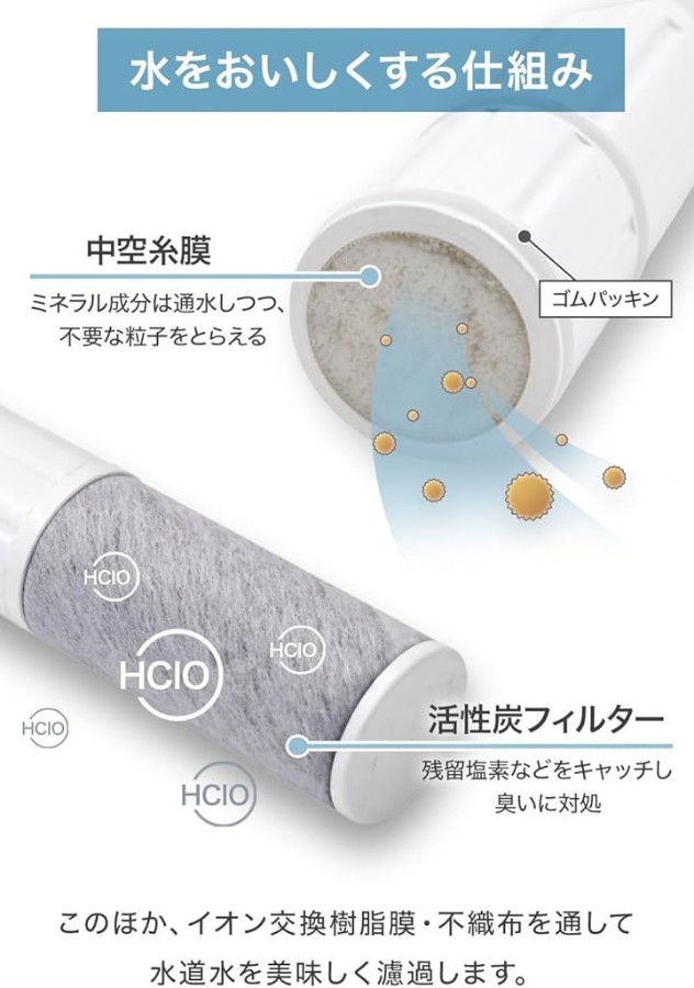 「ろ材の種類」 中空糸膜、イオン交換繊維、活性炭、不織布 「カートリッジ交換の目安」 1日10L使用の場合:約4ヶ月/1個 3個セットで合計約1年分 *使用水量・水質・水圧などにより、交換時期は前後する場合があります。